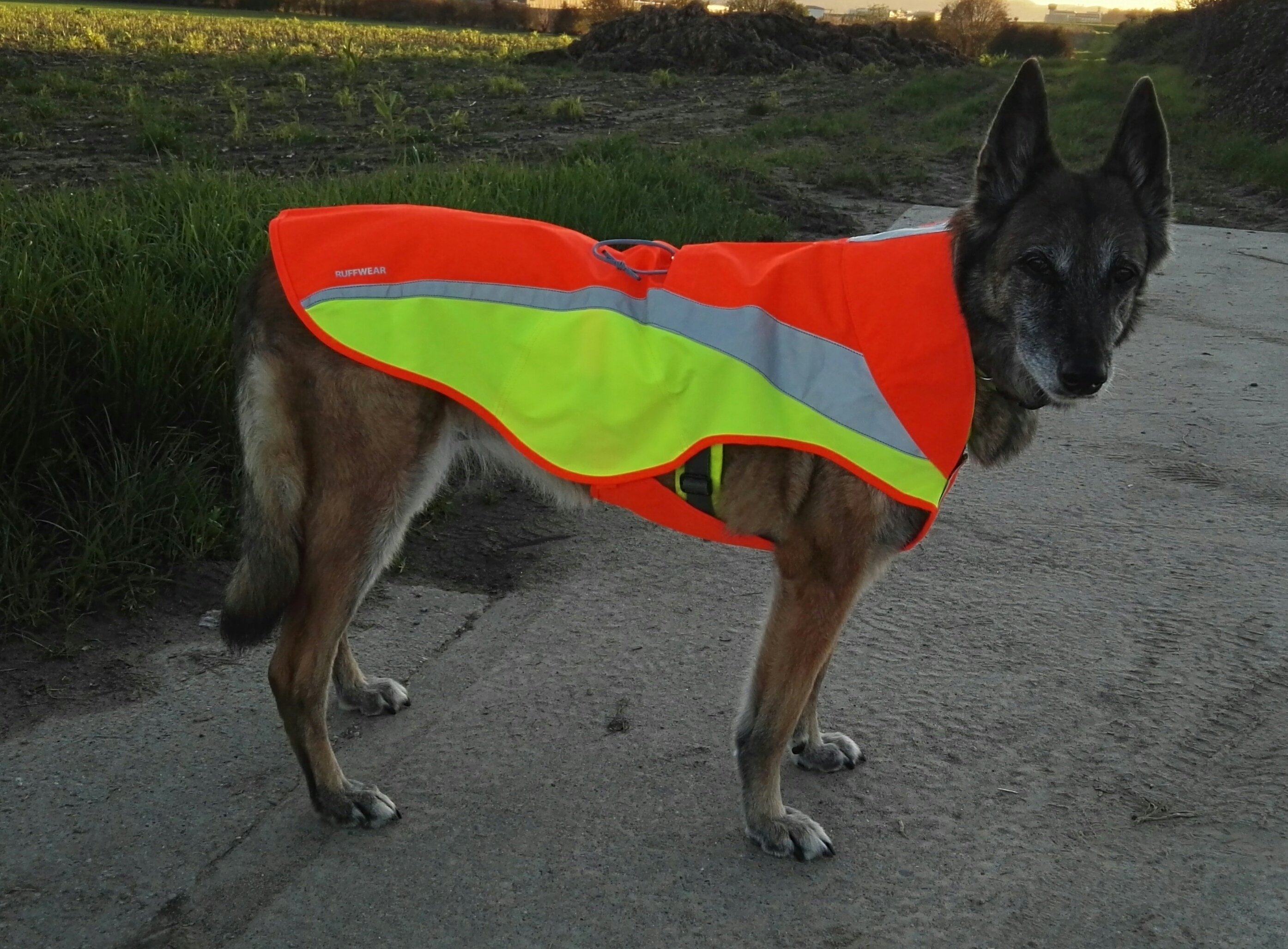 Incroyablement lumineuse dans le brouillard, à l'aube et au crépuscule. Coupe "décontractée" de Ruffwear, qui est une coupe ample, donne du confort et une visibilité +++ à 360° et laisse la place pour le harnais dessous sans tendre le tissus. Se voit bien de face comme de dos. La partie ventrale est doublée pour garder le chien au sec dessous. La meilleure veste dans le domaine de la visibilité. Enfin quelque chose de bien conçu qui taille grand. La boucle d'attache de mon harnais arrive exactement à l'ouverture prévue sur le dos, j'ai mis une cordelette à la boucle du harnais pour pouvoir la saisir rapidement. Photo: taille L sur Tina avec 80 cm de tour de poitrail, 70 cm de longueur de dos, 28 kg.
